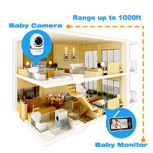 This camera is a remote 355° pan and tilt baby monitor with and 5″ color display attached. This baby camera monitor features a 5″ large screen. You can enjoy a larger view of your baby’s room by rotating the remote control camera 355° horizontally and 120° vertically. The 2X zoom function ensures a clear view. Silent camera rotation for a peaceful environment.